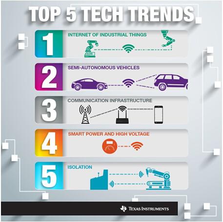 在迎接2015到來之際,我們有必要花時(shí)間來評(píng)估和預(yù)測(cè)未來的一年中將會(huì)出現(xiàn)的技術(shù)挑戰(zhàn)和突破創(chuàng)新。通過與眾多戰(zhàn)略客戶、大學(xué)合作伙伴以及TI產(chǎn)品線的技術(shù)專家進(jìn)行探討后,我們認(rèn)為TI將在一些重要技術(shù)趨勢(shì)中發(fā)揮戰(zhàn)略性作用。這些技術(shù)趨勢(shì)正推動(dòng)著汽車和工業(yè)等多個(gè)市場(chǎng)的發(fā)展,而在此過程中,TI的工程師將幫助應(yīng)對(duì)半導(dǎo)體技術(shù)領(lǐng)域的獨(dú)特挑戰(zhàn),并利用先進(jìn)技術(shù)改善我們的生活。